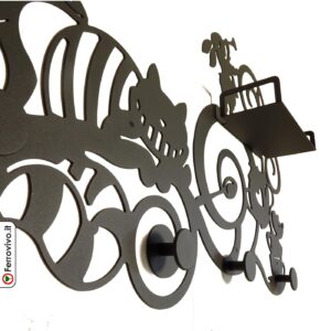 Un porte manteau sur le thème d’Alice au Pays des Merveilles avec une étagère vide-poche utile, pour une entrée de conte de fées.