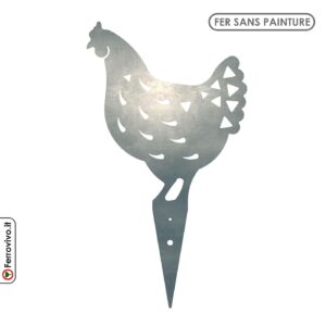 Silhouette de jardin en forme de poule, réalisée en métal brut. Nous appliquons généralement une peinture en poudre sur nos produits, mais dans ce cas, la silhouette est sans finition, idéale pour les amateurs de décorations de jardin à l’aspect rouillé.